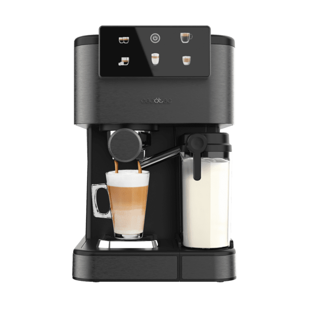 Power Espresso ColdBrew Latte Dark Halbautomatische Kaffeemaschine mit Coldbrew-System, Touchscreen-Display und Milchbehälter.