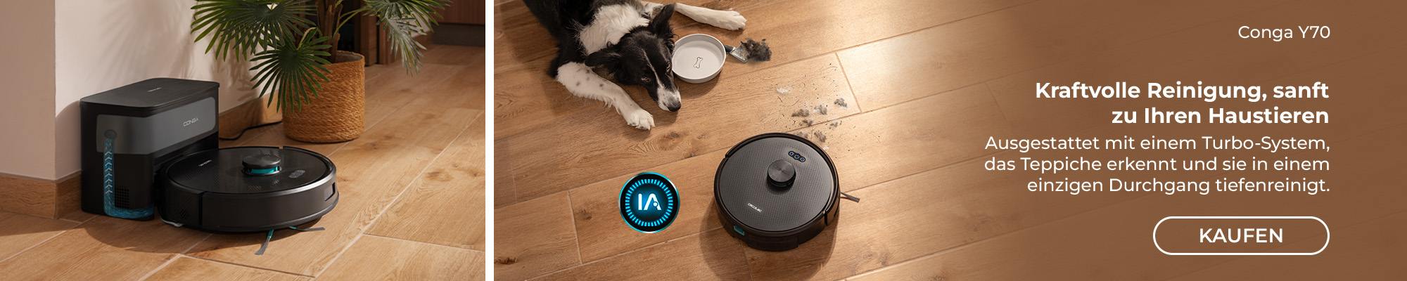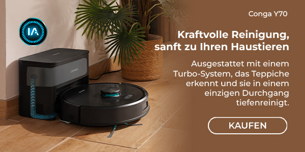 Conga Y70 Staubsaugerroboter. Lasernavigation. 20000 Pa Saugdruck. (Autonomie). Spezielle Silikonbürste für Haushalte mit Haustieren. Selbstentleerende Basis mit 3-Liter-Staubbeutel.